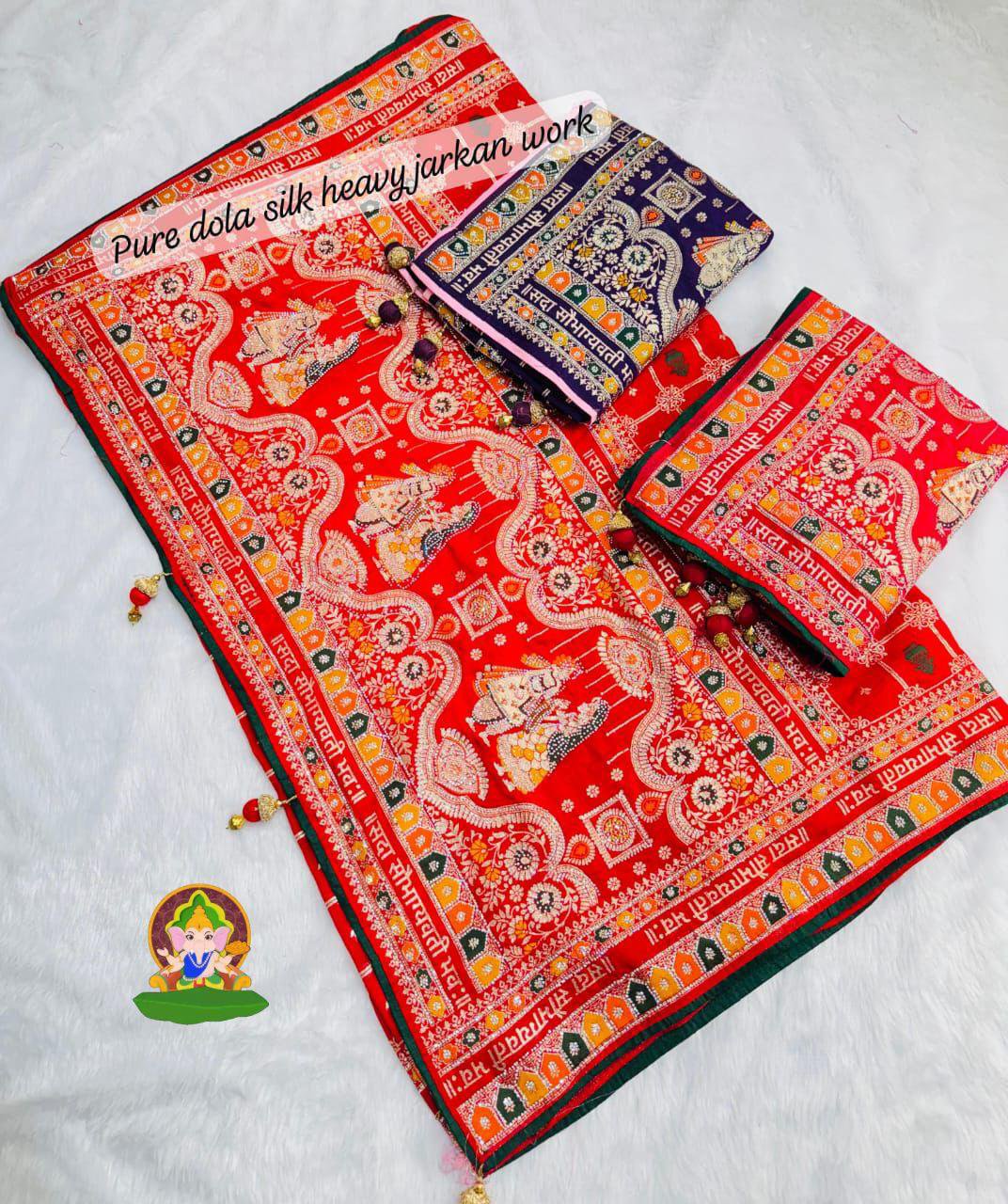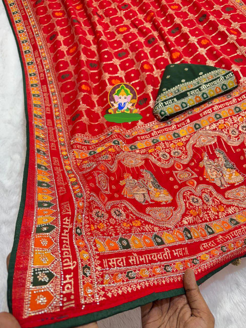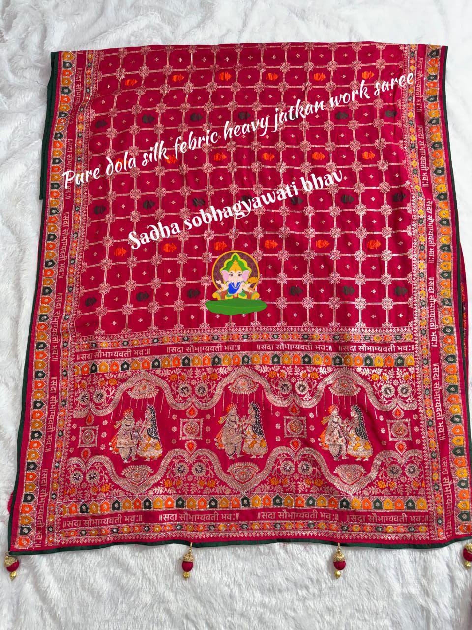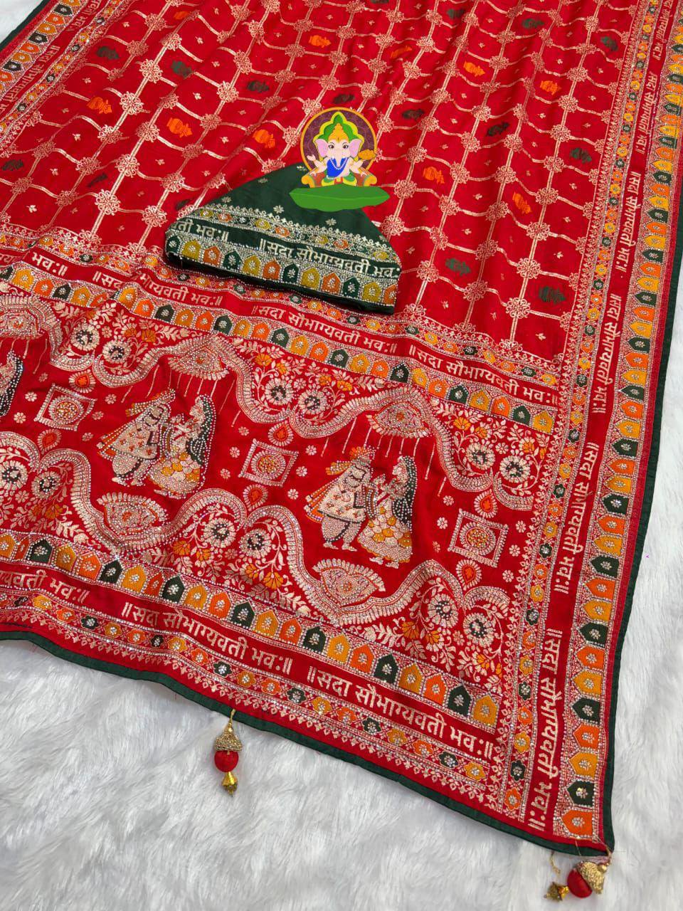 Pure Dola Viscose 3 Colours Meenakari Zecard Weaving Saree With सदा सौभाग्यवती भव: Design And Jarkan Diamonds With Heavy 4 Latkan & Contrast Matching Piping On Full Saree