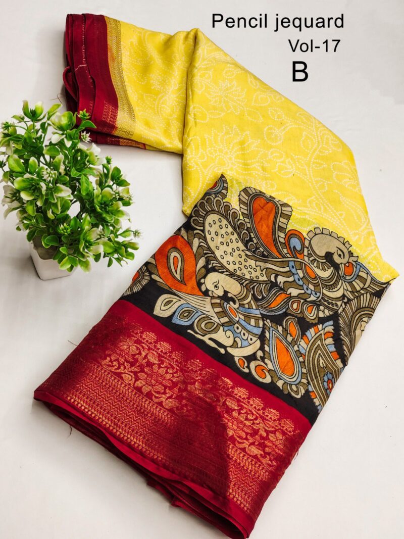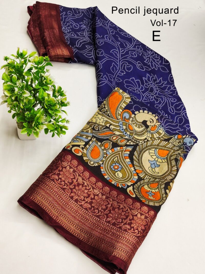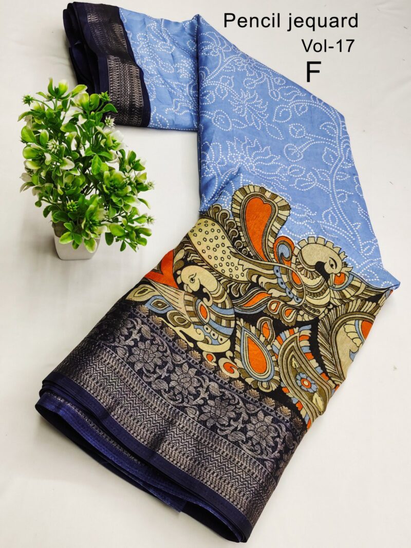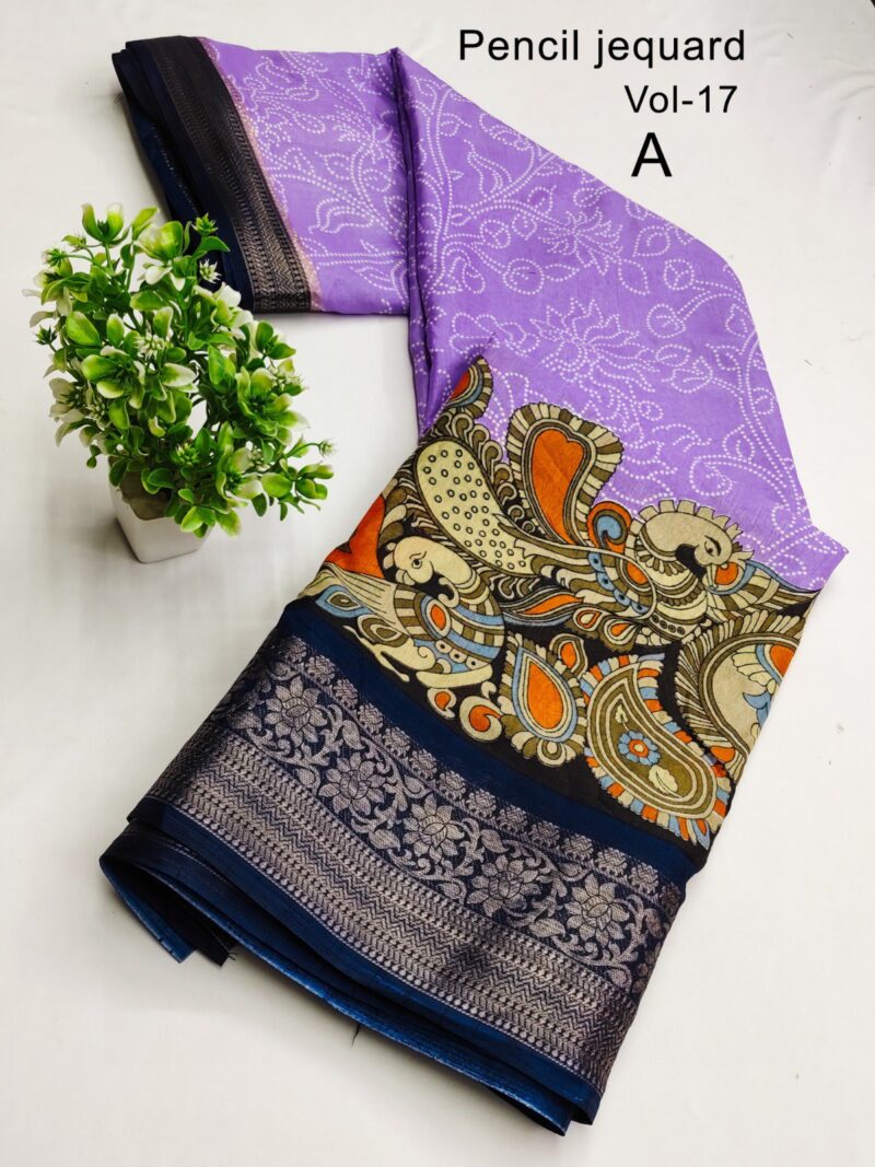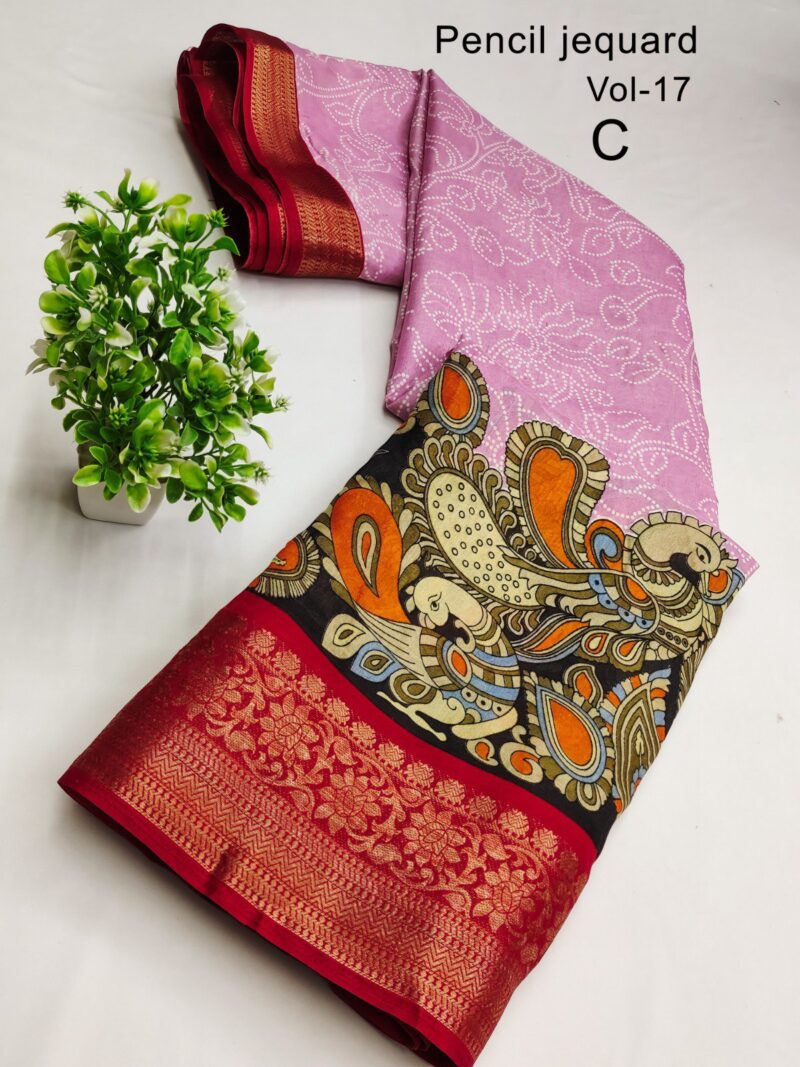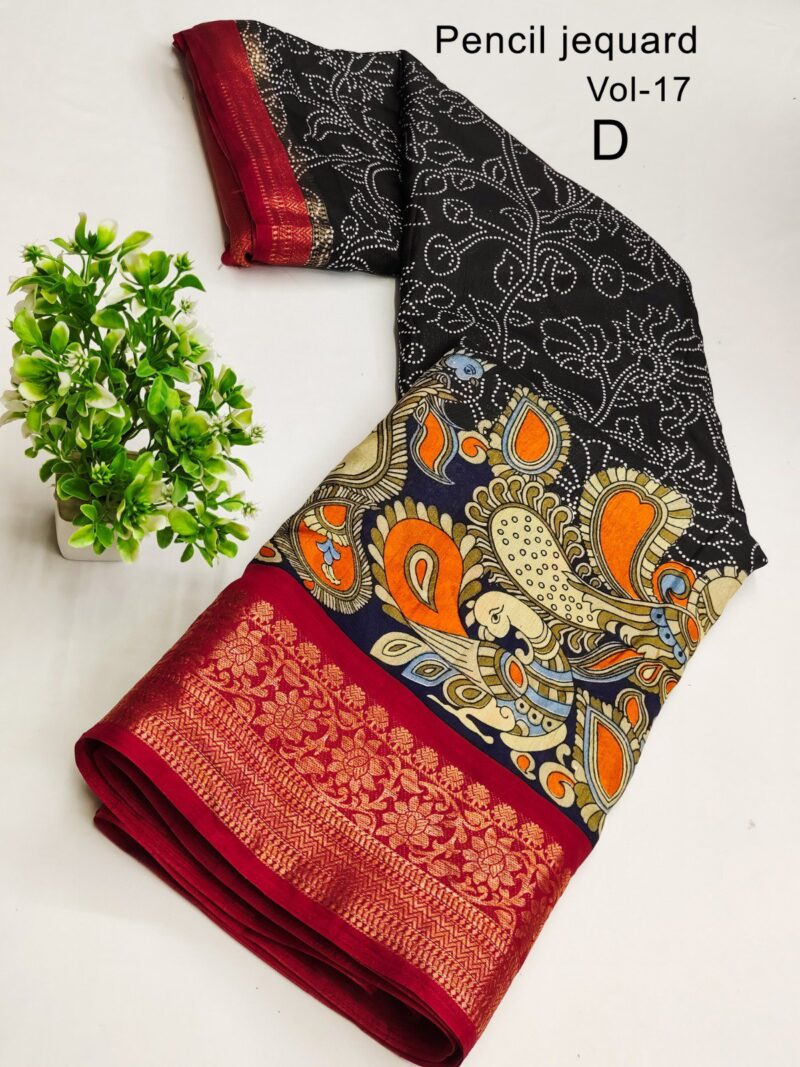 3 Inch Gold Zari Pencil Jacqrad Weaving Pattu Border Dola Silk Fabric Digital Kalamkari Printed Saree