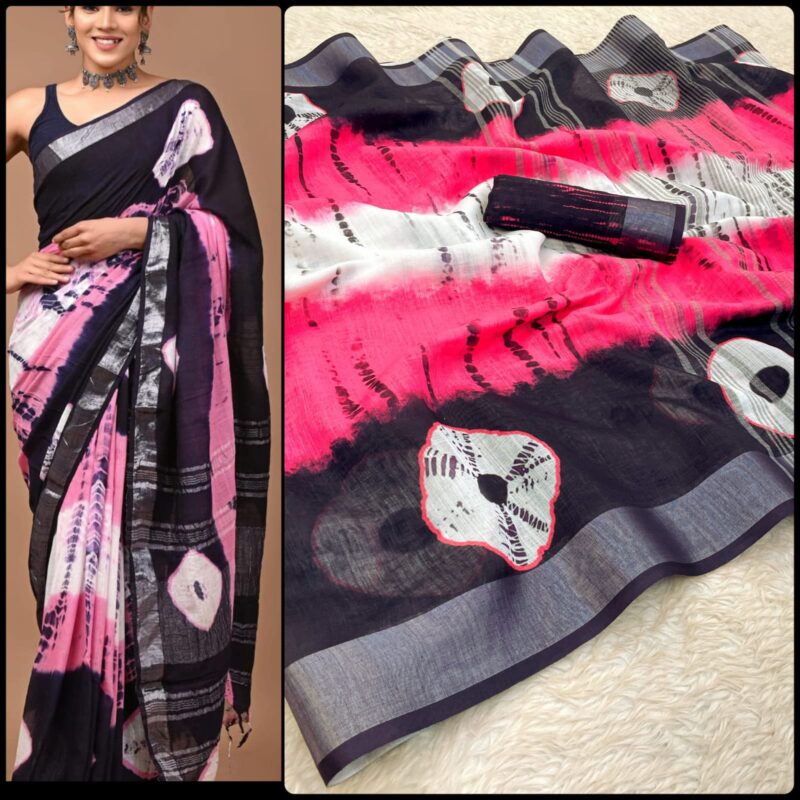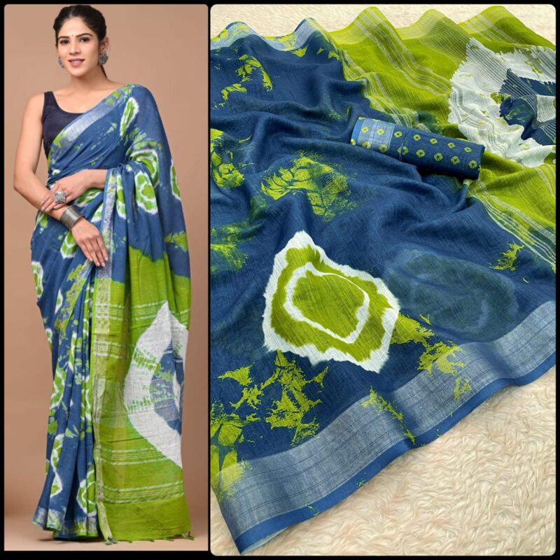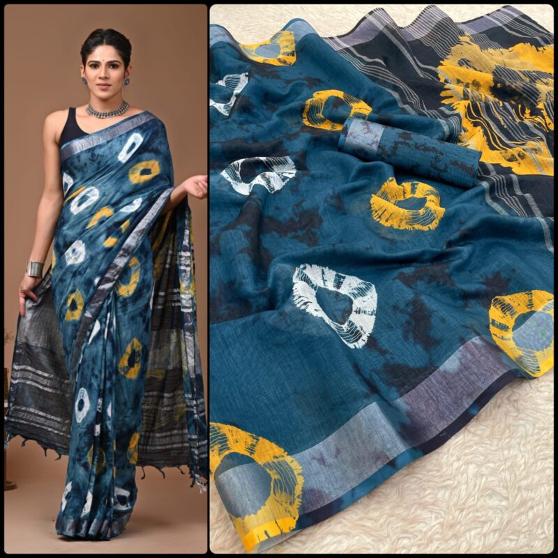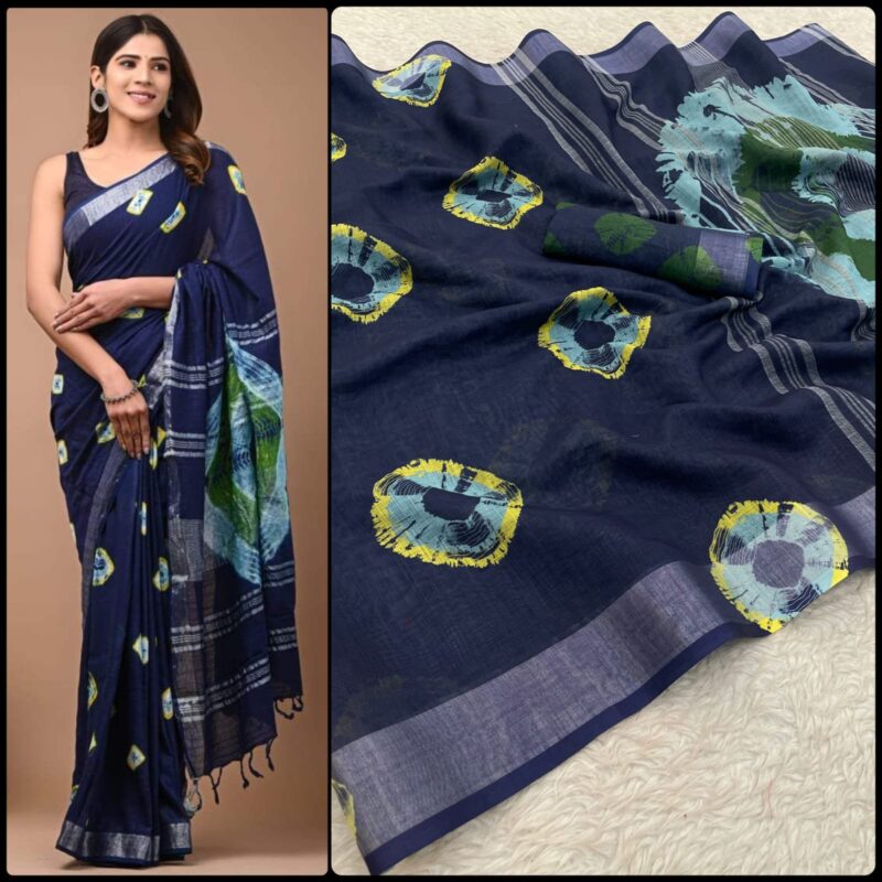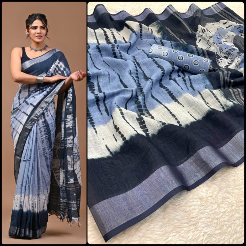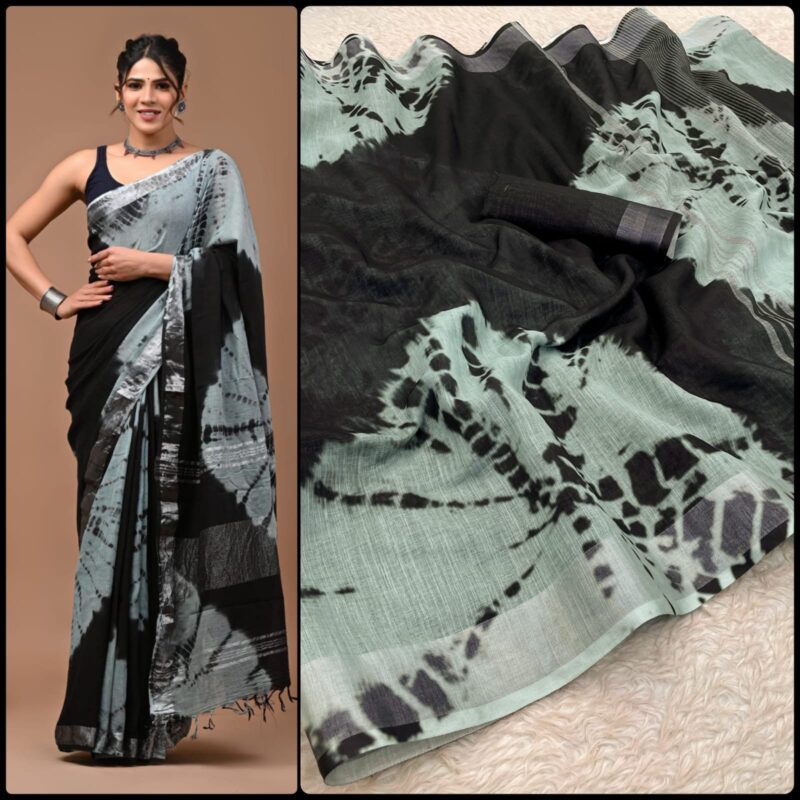 Linen Digital Print Saree With Silver