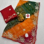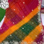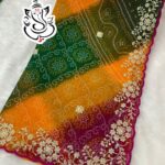 additional details-: saree have silver zari pita c.Pallu emb work..also having beautiful border cutwork border..also added with emb pita zari work blouse ..saree have extra ordinary kerry bandhej mill print pattern in best quality ..