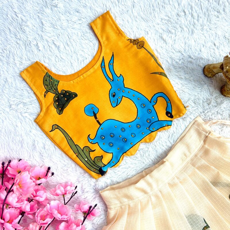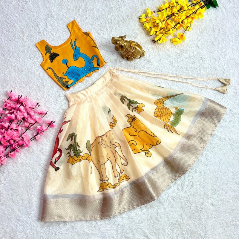 *Soft Printed Work on Kota Checks Cotton fabric with Beautiful Printed Work Lahenga with Diamond Hand Work Design*