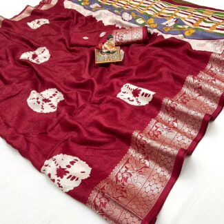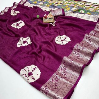 PREMIUM SOFT MUGA COTTON SAREE WITH CLASSIC COLOURFULL RESHAM WEAVING PALLU AND TRADITIONAL ZARI WEAVING BORDER AND ALL OVER RESHAM WEAVING BUTTIES AND FANCY TASSELS WITH CONTRAST BLOUSE PIECE